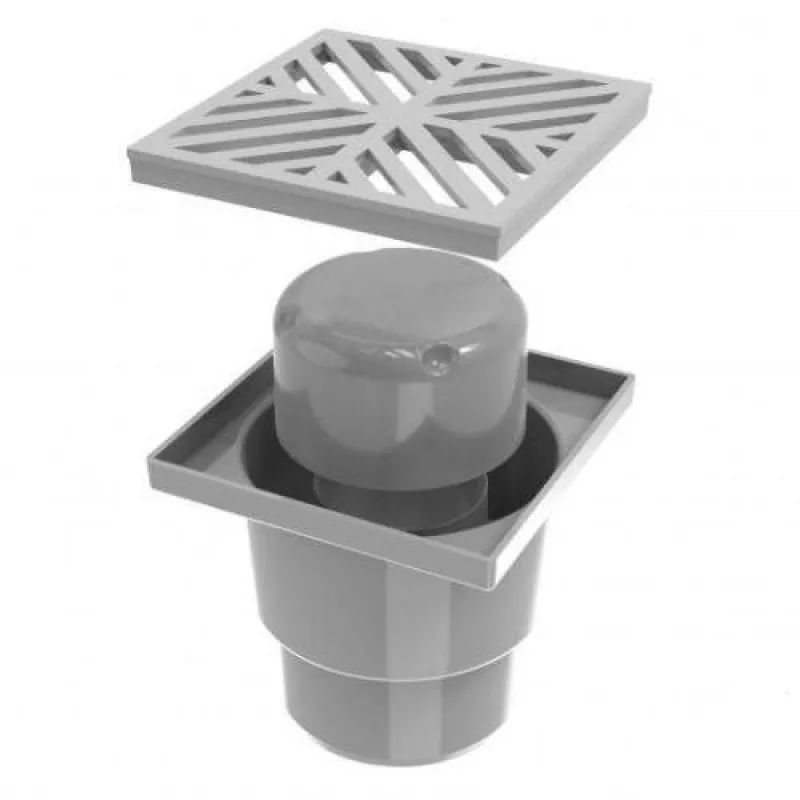 Point shower drain with plastic grate 150×150 mm, with vertical outlet DN110, with water seal.